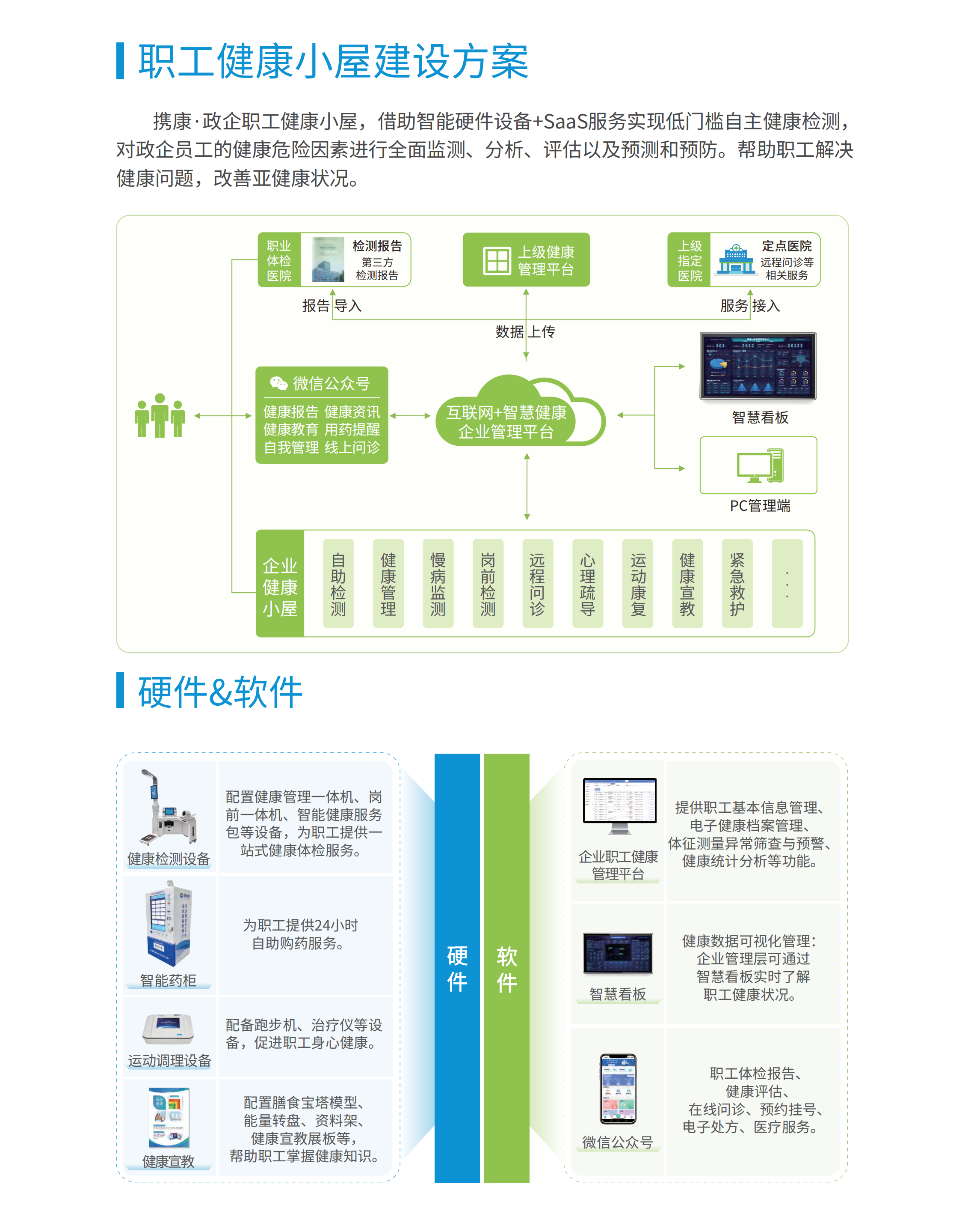 健康员工:政企员工健康小屋,是携康针对国内员工普遍亚健康状况,为政企单位量身打造的有针对性的健康空间,借助智能硬件设备+SaaS服务实现低门槛自主健康检测,对政企员工的健康危险因素进行全面监测、分析、评估以及预测和预防的全过程。帮助员工解决健康问题,改善亚健康状况。